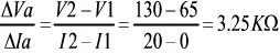 The intersection of the tangent line the with axis Ua gives us point with the values Ia = 0 mA and Ua = 65 Volt. The intersection of the tangent line the with the top boarder of the 6922's chart gives us point with the values Ia = 20 mA and Ua = 130 Volt. Plugging these numbers in the formula gives us anode resistance of 3.25 KOhm.